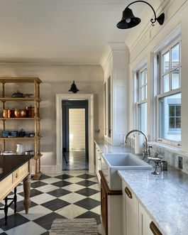 Originally envisioned as a family heirloom retreat, this European old-world–inspired home overlooks the Pacific Ocean. The residence features Douglas fir shiplap, handcrafted marble tile, and carved limestone mantels and fireplace surrounds throughout. Its charm lies in the thoughtful preservation of old-world details, including a hand-operated dumbwaiter, radiant heaters, button light switches, and classic belted ceiling fans.